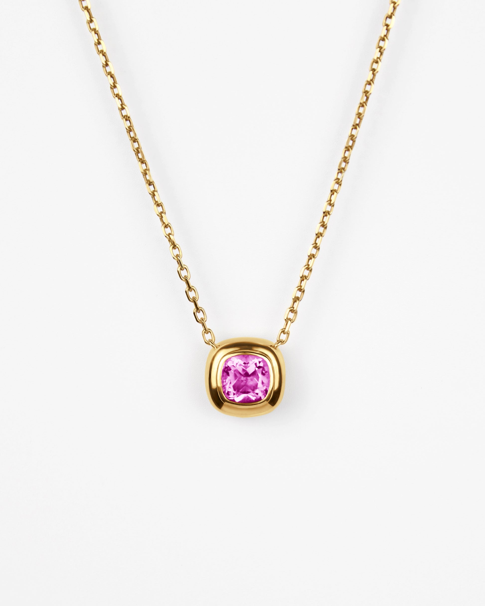 An emblem of bold simplicity. The Large Puff Pendant showcases a 7mm cushion-cut gemstone, magnified by a sculptural bezel of polished 18k gold. Graceful proportions and luminous presence offer the versatility to shine as a statement on its own or as part of your everyday layers.