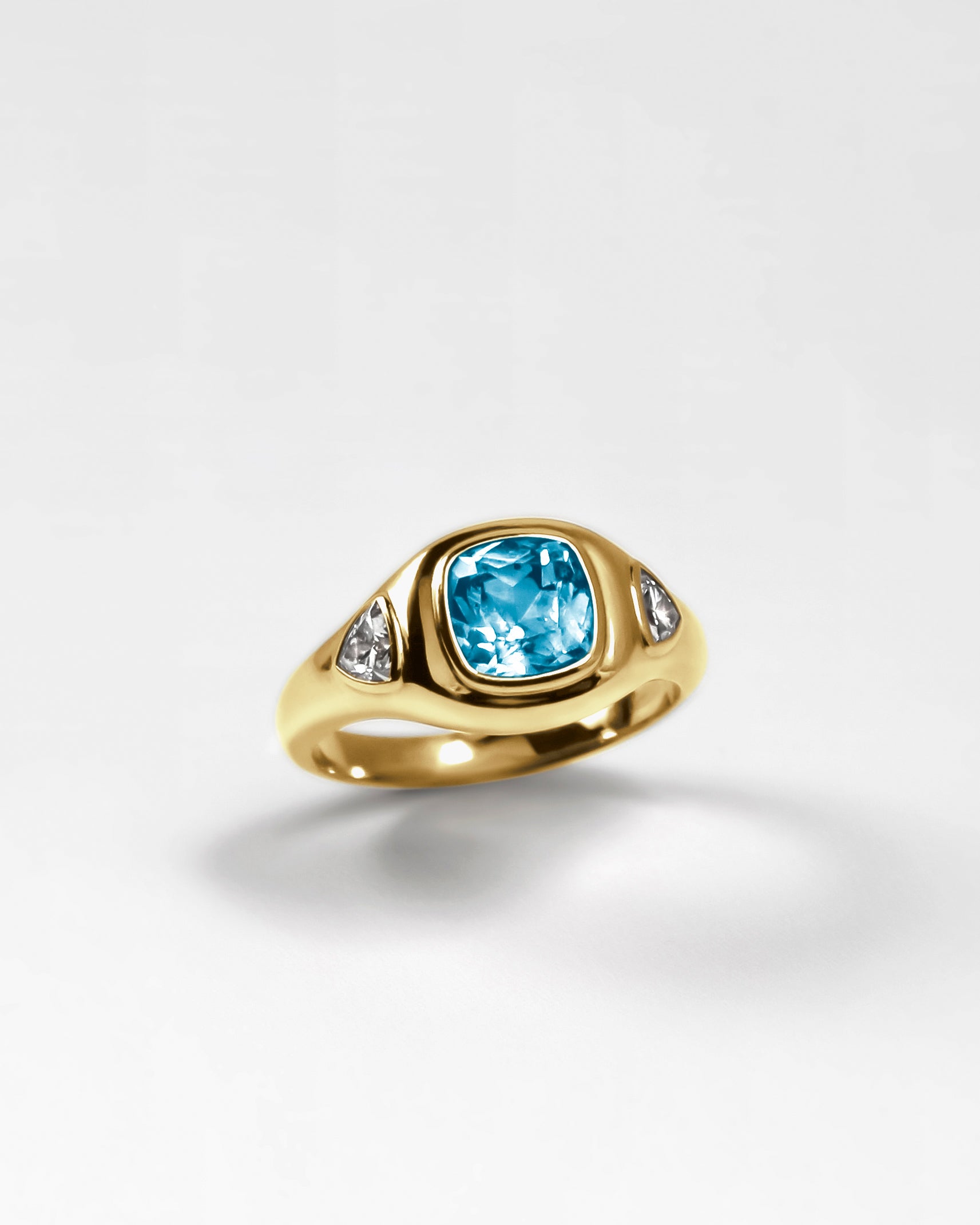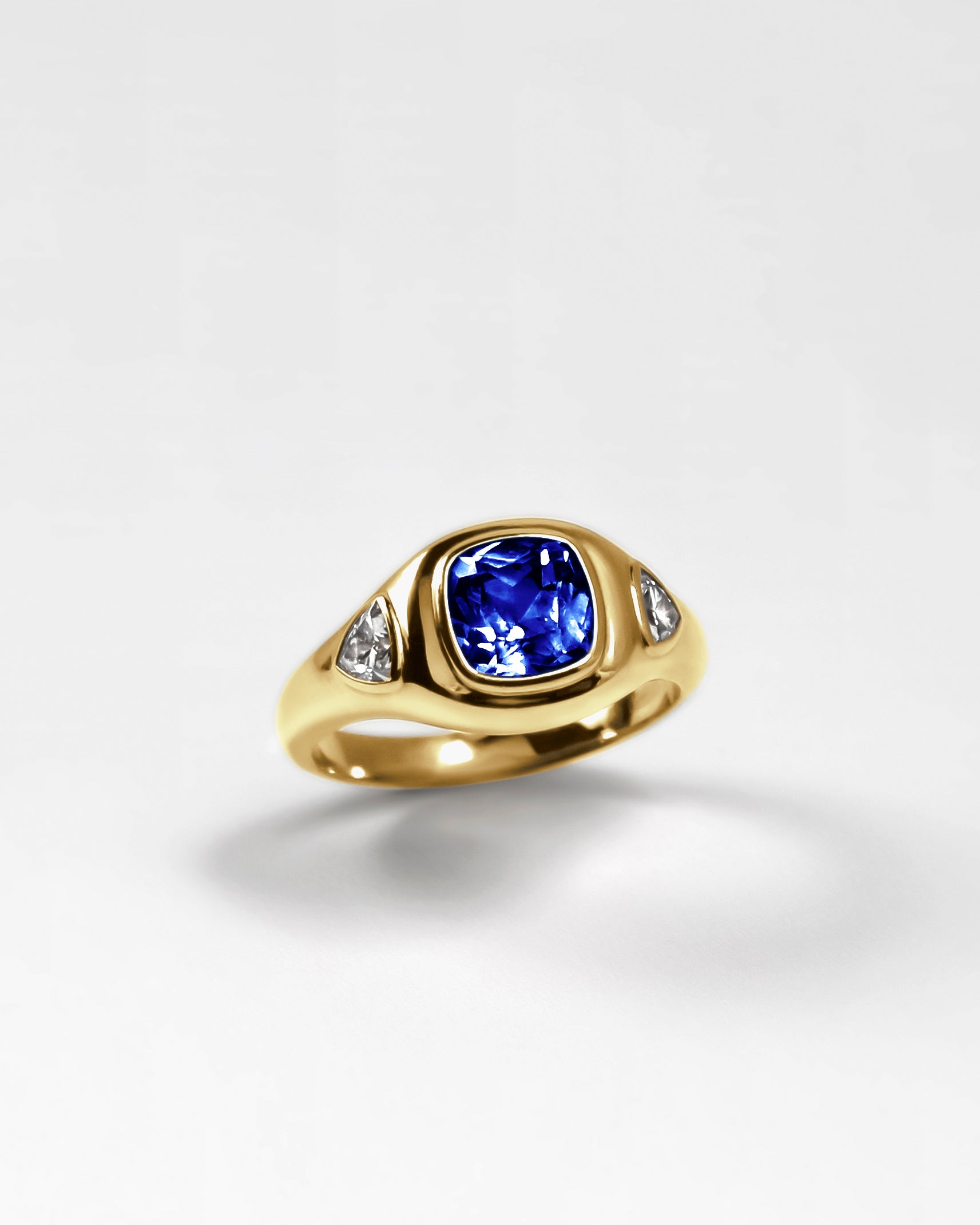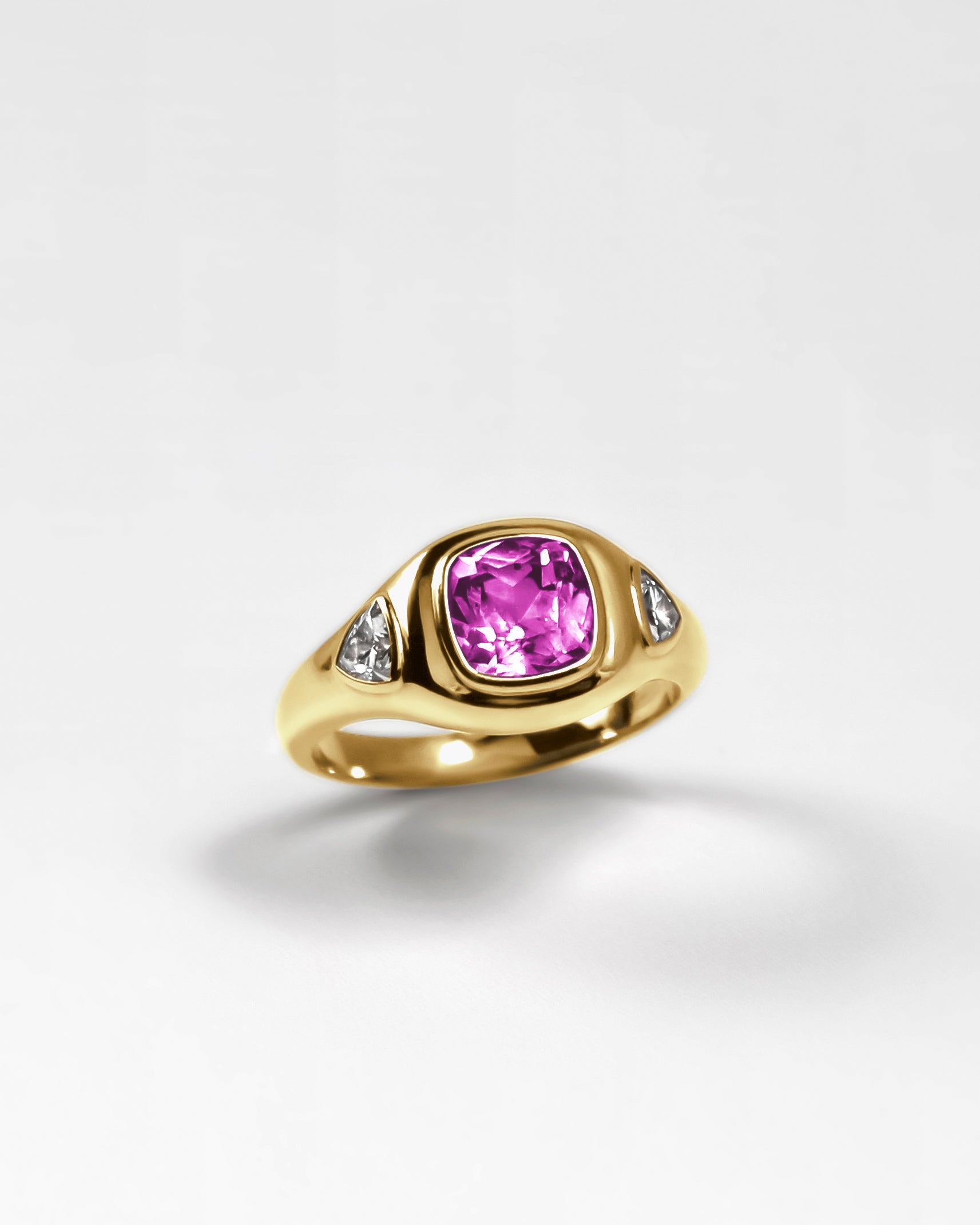 A bold pop of color with serious sparkle, the Puff Ring features a vibrant cushion-cut gem, accented by a pair of trillion-cut diamonds. Crafted in high-polish 18k gold, this playful yet powerful silhouette is a fresh, modern take on a classic three-stone ring.