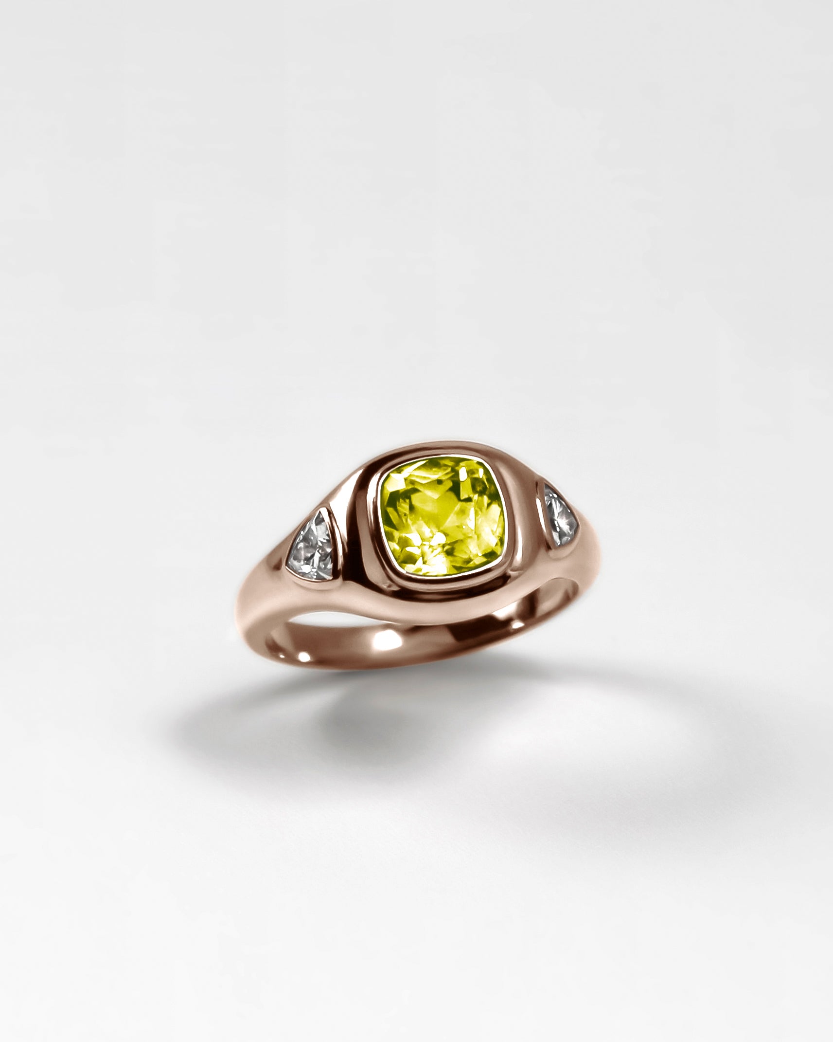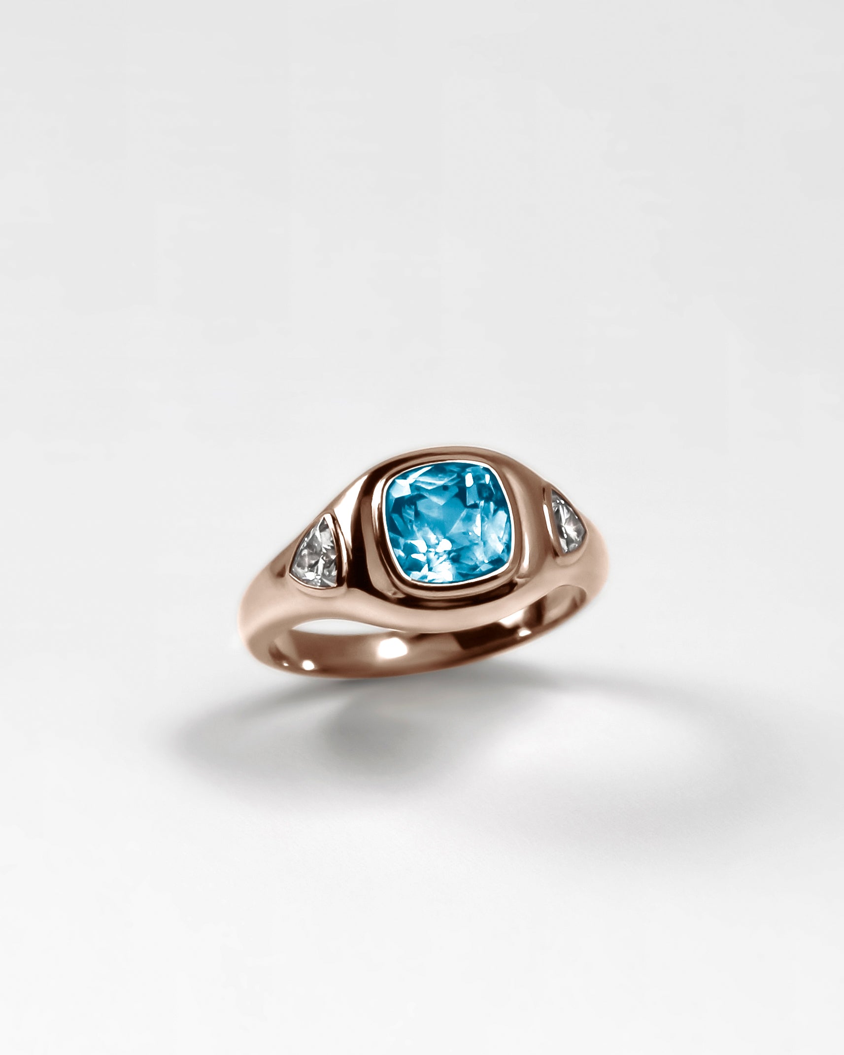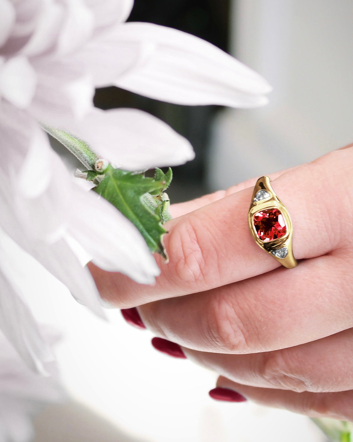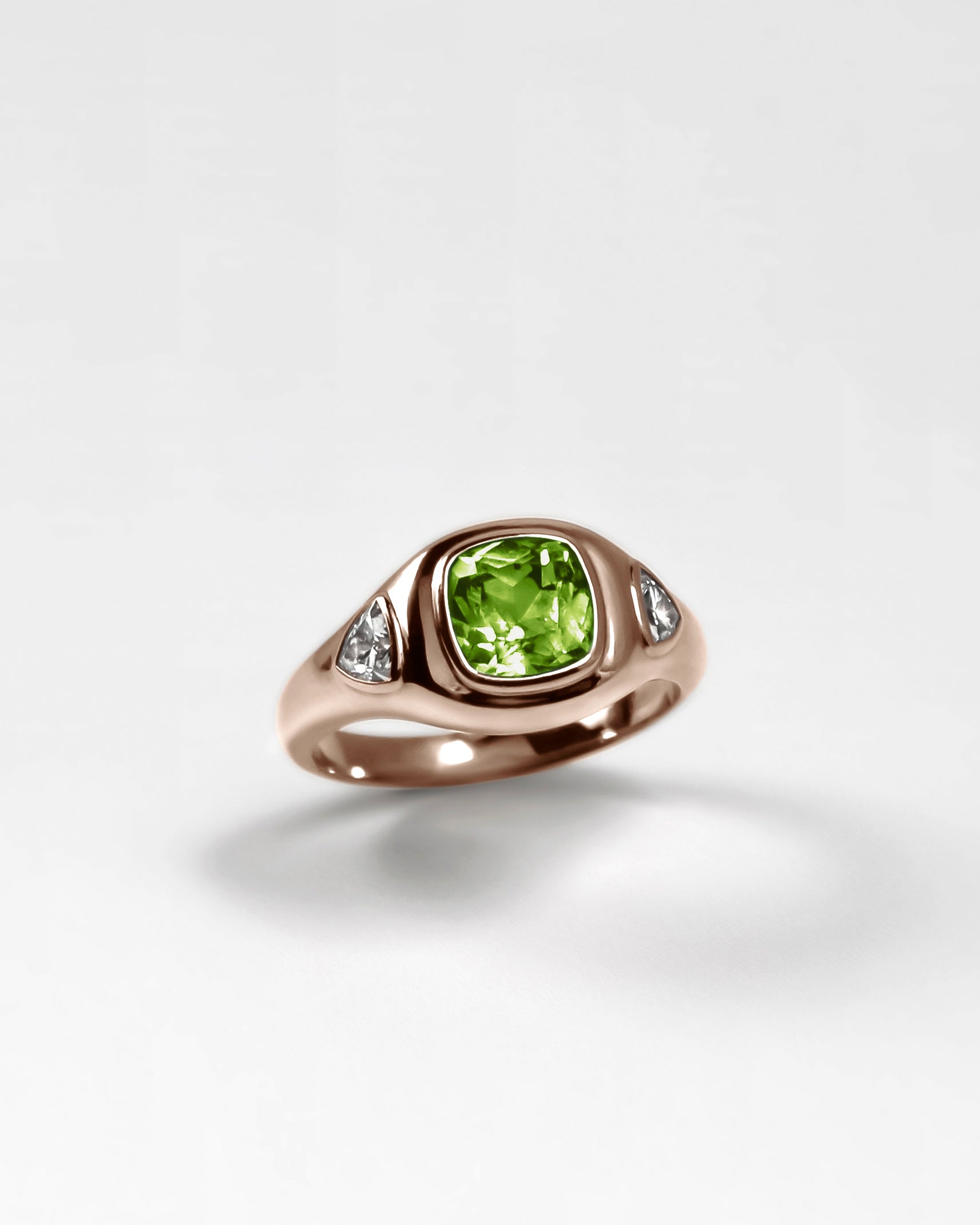 A bold pop of color with serious sparkle, the Puff Ring features a vibrant cushion-cut gem, accented by a pair of trillion-cut diamonds. Crafted in high-polish 18k gold, this playful yet powerful silhouette is a fresh, modern take on a classic three-stone ring.