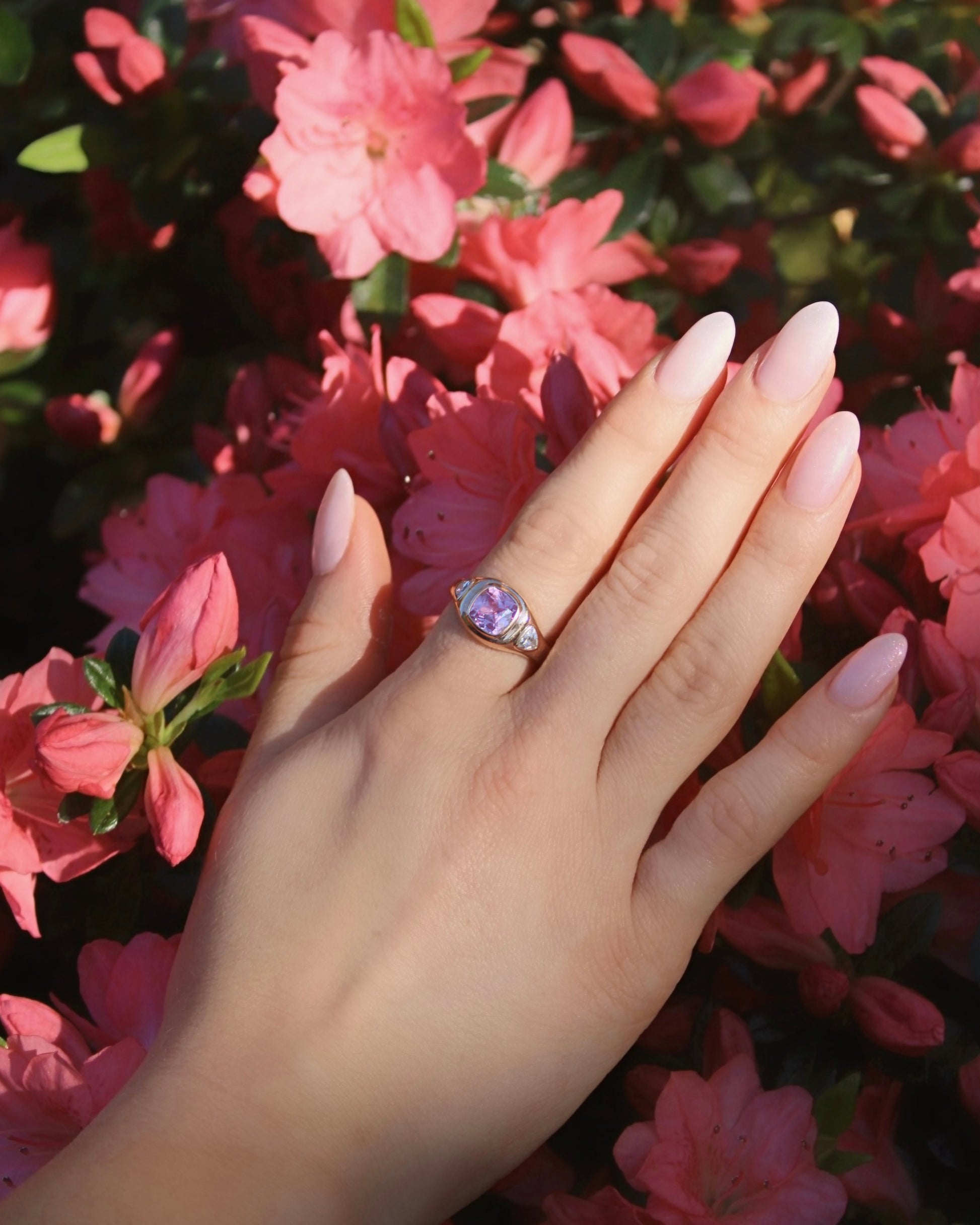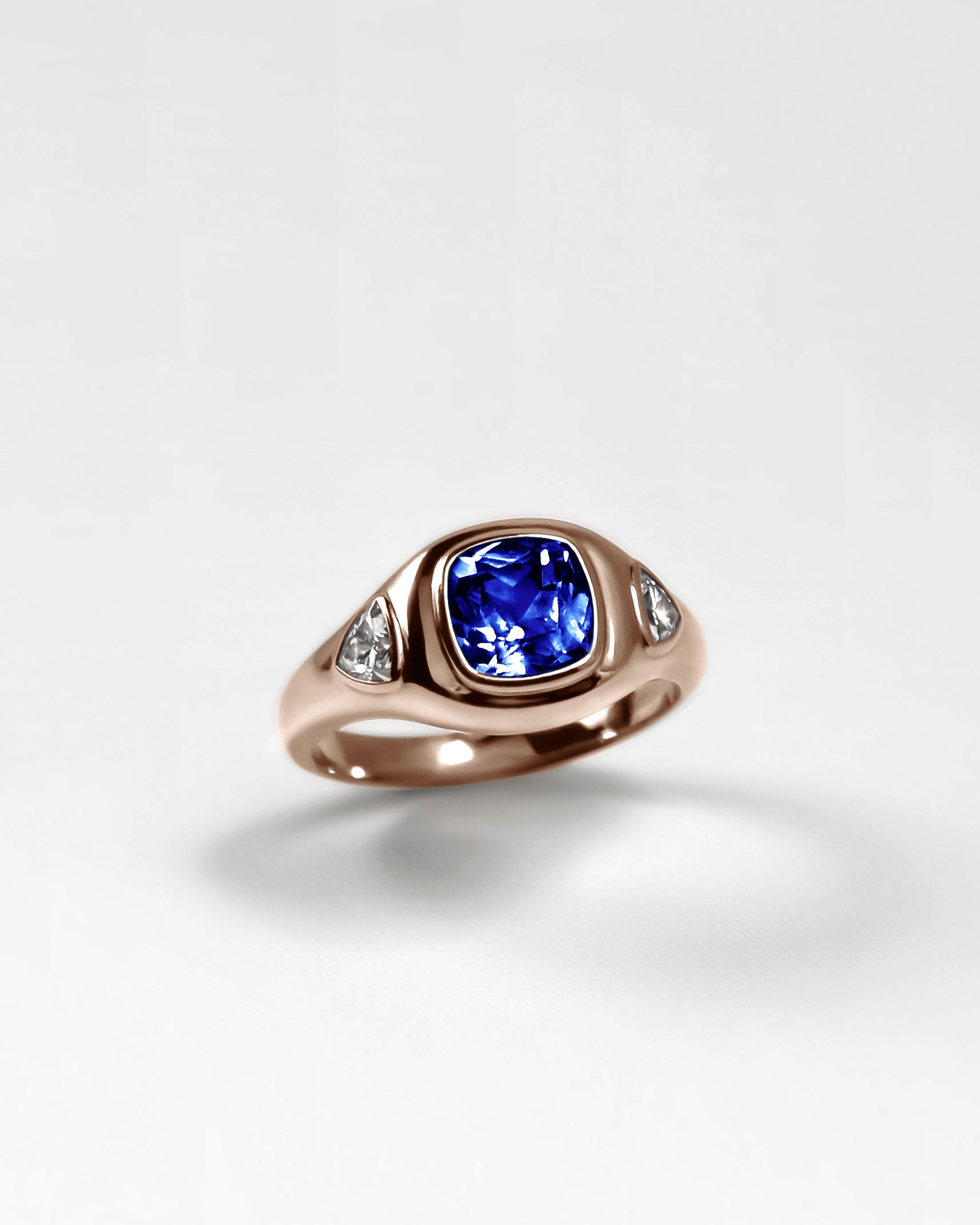 - Lab-grown center stone options: blue, pink, or yellow sapphire