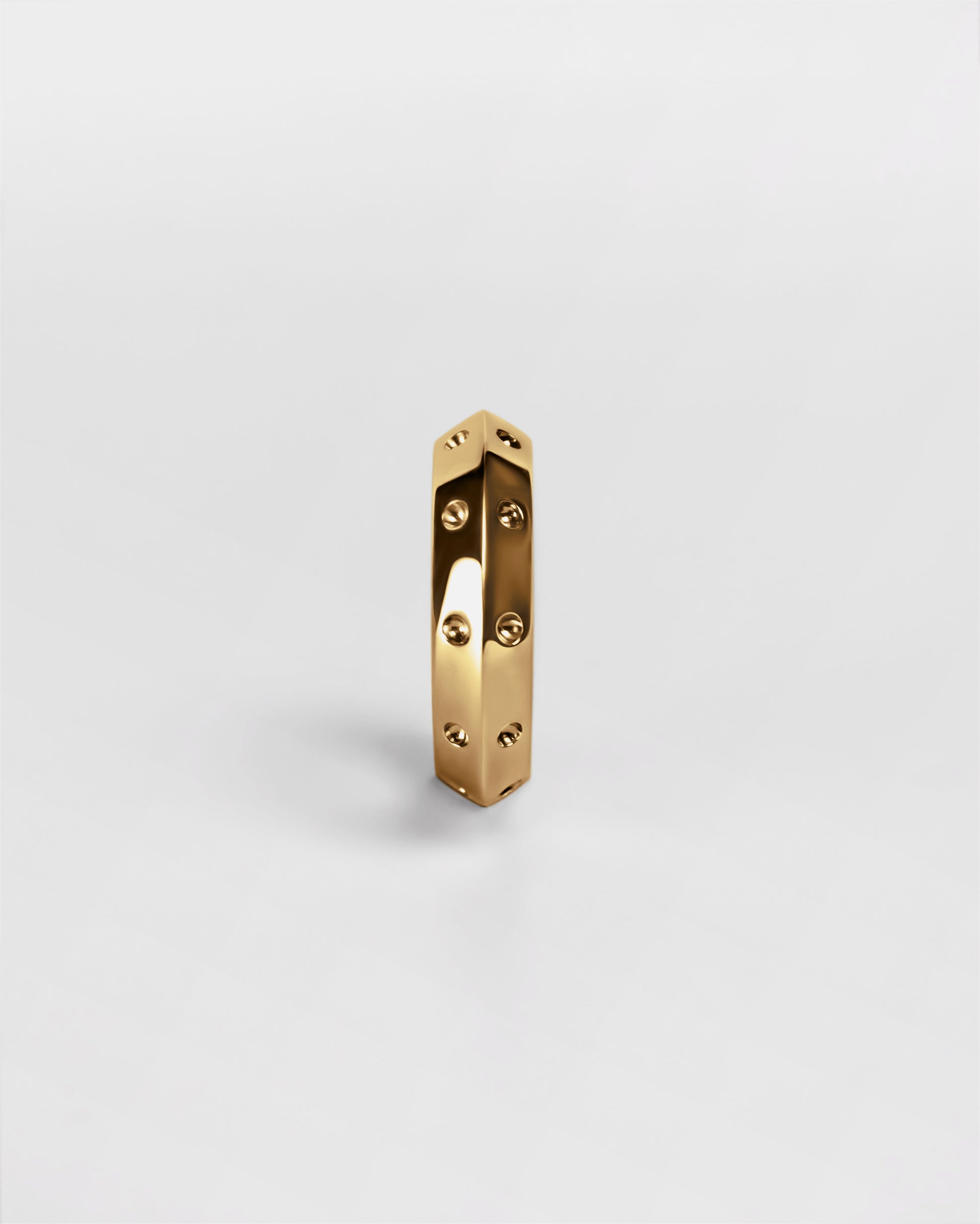 Sleek. Bold. Unapologetically modern. The Rivet ring features recessed rivet domes that catch and reflect light like liquid metal, adding depth and dimension to the sculptural silhouette. Inspired by industrial design, these hoops balance edge and elegance in a way that feels both architectural and wearable.