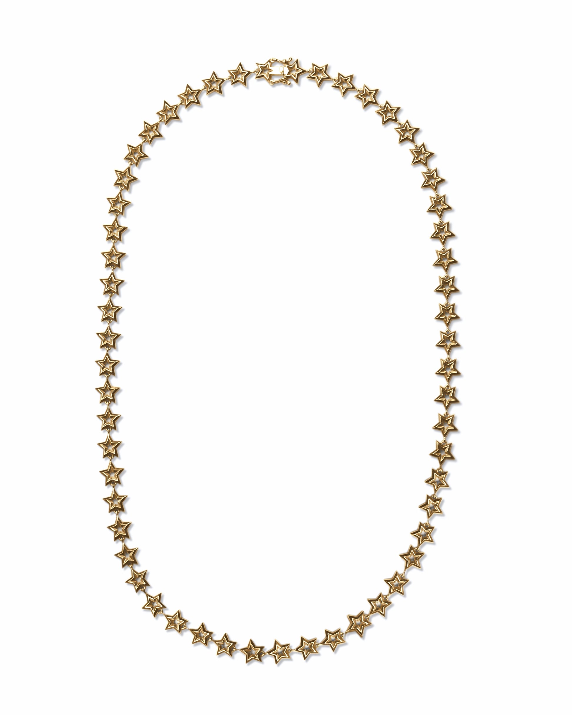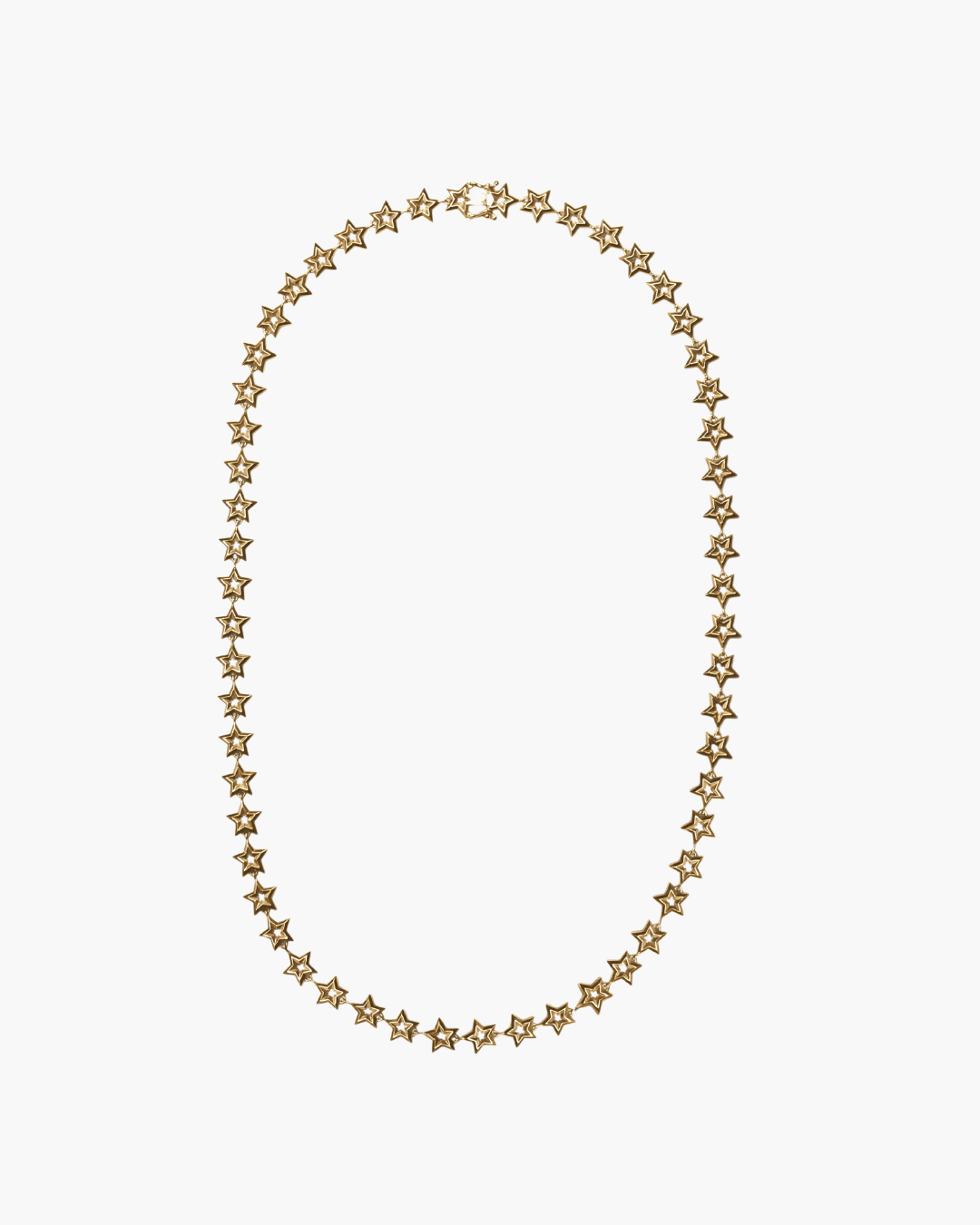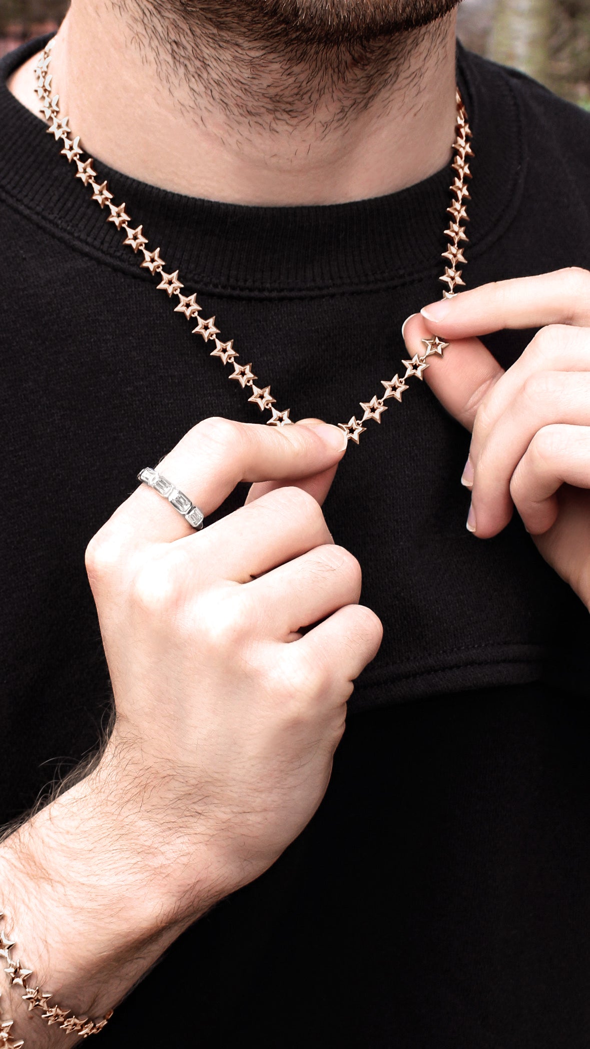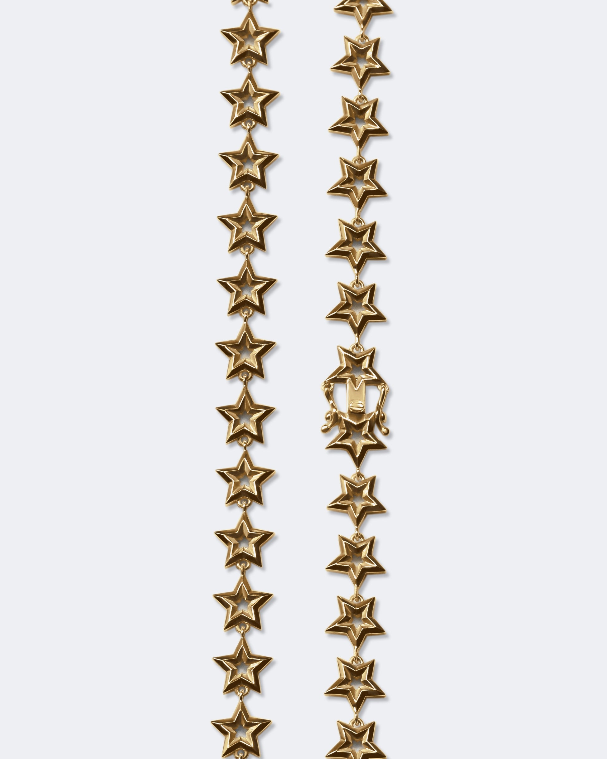 Inspired by the endless beauty of the night sky, the Star Link Necklace is a bold yet refined expression of celestial elegance. Featuring a seamless sequence of sculptural, knife-edge stars, each link captures and reflects light from every angle, creating a luminous effect that commands attention.